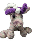 A cuddly plush unicorn with a chunky textured body in mottled pinks, purples, and grays. Its spiral-curl mane and tail in bright purple and white yarn create a delightful pop of magical energy. Large, sparkling eyes make this unicorn look wide-eyed and ready for play or cuddles.