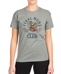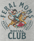 Heather gray crew-neck t-shirt printed with a vintage-style design of a wild mama riding a fierce tiger over a red rose. The words feral moms curve above and social club sits below, with raising hellions framing the sides. The worn-in print and relaxed fit make it feel like your favorite old tee.