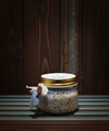 Presented in a reusable glass jar with decorative ribbon and scoop