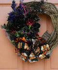 This Boo-tiful Black Rose Wreath is your go-to for sophisticated spookiness. Featuring black roses, glittery branches, striped pods, and a shimmering black-and-white pumpkin at its heart, this piece channels Halloween chic. Venus flytrap accents give it just enough eerie edge.