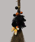 A whimsical, handcrafted witch broom adorned with candy corn, black florals, and sweet vanilla scent—perfect for Halloween decor!