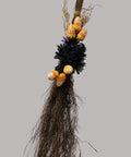 Celebrate spooky season with a touch of sweet charm! The Candy Corn Witch Broom – Vanilla Scented combines rustic autumn vibes with playful Halloween flair. Hand-tied from natural twigs, this full-size decorative broom features clusters of soft faux candy corn, glittered Halloween balls, and dramatic black and purple flowers. Subtly infused with a cozy vanilla fragrance, it brings both visual delight and seasonal aroma to your space. Perfect for hanging by your door, leaning in your entryway, or standing in a corner as a festive accent.