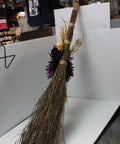A whimsical handcrafted witch broom decorated with candy corn accents, spooky florals, and a warm vanilla scent.