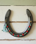 Hand-decorated horseshoe adorned with beads and a western boot for rustic charm and good fortune.