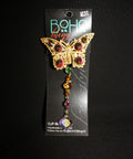 Add a little dazzle to your day with this stunning clip-on piece from Boho Bling. The glittering butterfly centerpiece is encrusted with faceted iridescent stones in pink, green, and gold hues—all set in a radiant gold-tone frame. A delicate string of sparkling beads and a prism-like crystal dangle below, catching the light with every move. Whether worn on boots, in your hair, or along your favorite necklace or belt, this versatile clip brings a playful yet regal boho glam to any outfit.