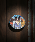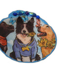 Brighten up your space with this joy-filled shell art dish by Outrageously Millie, celebrating furry friends and sunshine. This natural scallop shell is hand-painted in playful blue and brown tones, and transformed into a decorative delight featuring three adorable dogs dressed in charming outfits with butterflies and flowers all around. Topped with tiny blue jewels and faux seashells, this one-of-a-kind piece is perfect for pet lovers and whimsical hearts alike.