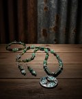 This artistic abalone set features a swirling tri-shell pendant paired with matching green-toned beads.