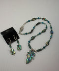 Nature meets shimmer in this abalone oak leaf jewelry set with teal and shell accents.