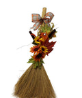 Welcome the beauty of autumn into your home with this charming Autumn Harvest Broom Décor. Crafted from natural broomcorn and straw, this decorative broom features a cascade of lifelike faux maple leaves, golden sunflowers, berry sprigs, and mini cattails—all wrapped in a cheerful plaid ribbon bow. Whether displayed on your porch, in an entryway, or hung on a wall, this seasonal piece brings cozy, homespun warmth to your fall decorating.