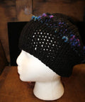 Cozy black knit beanie accented with handspun galaxy-inspired yarn in purple and blue tones.