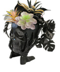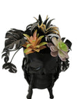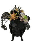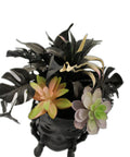 Add a unique mix of spooky and sweet to your seasonal décor with this black skull planter arrangement. Featuring a matte black skull base cradled by skeletal hands, this piece is filled with dramatic black faux foliage accented by pastel-hued succulents. The soft greens, pinks, and yellows stand out beautifully against the dark backdrop, giving it a hauntingly elegant yet slightly playful charm.