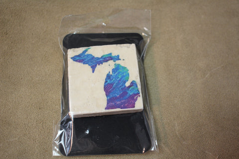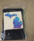 This square stone magnet features a clean cream-colored base with a striking watercolor rendering of Michigan’s Upper and Lower Peninsulas in rich hues of blue, green, and violet. The natural texture of the stone adds depth, while the print pops with a bold, modern vibe. It comes thoughtfully packaged on a black card and wrapped in clear plastic—perfect for gifting.