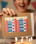 This handmade birthday card by Cards for a Cause is bursting with red, white, and blue spirit. Striped, starred, and polka-dotted candles in classic Americana patterns are topped with bright yellow flames, set against a natural kraft cardstock base. It’s a fun and festive way to send birthday cheer—especially great for summer birthdays, veterans, or anyone who loves a little patriotic flair.