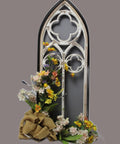 Infuse timeless elegance into your space with this Cathedral-Style Arch Wall Decor, featuring a stunning blend of rustic charm and soft floral beauty. The arched frame mimics classic Gothic window architecture, with distressed white wooden panels framed by a sleek black metal outline, adding depth and contrast.