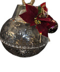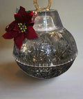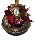 Add a magical glow to your holiday home with this beautifully upcycled hanging ornament crafted from a repurposed vintage-style glass light fixture. Styled to resemble a giant holiday bell, this clear cut-glass piece is adorned with festive floral décor, a purple Christmas ball ornament with golden accents, faux poinsettia blooms, jute twine detailing, and a cross-stitched snow globe accent. The top is finished with a wrapped rope ring for easy hanging. A rustic and elegant addition to your seasonal décor!