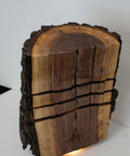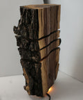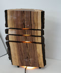Natural hardwood lamp with bark edge and warm glowing LED lines for cozy cabin charm.