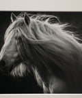 A timeless black and white portrait of a long-maned horse gazing softly into the wind.