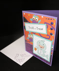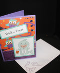 Created by Pink Paper Studio, this card pops with seasonal colors—orange, purple, and green—layered with playful details like spiderweb patterns, pumpkins, and a smiling dino in costume carrying a jack-o’-lantern treat bucket. Glittery accents and a matching envelope with a spiderweb sketch complete the set, making it perfect for sharing spooky cheer with friends and family.