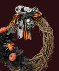 A spooky-chic grapevine wreath with bold black foliage, glittery creatures, and Halloween ribbon flair.