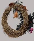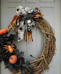 Add a playful fright to your front door with our Hauntingly Fun Halloween Wreath! Handcrafted on a rustic grapevine base, this eye-catching wreath blends eerie elegance with a touch of whimsy. Deep black faux leaves set the stage for vivid Halloween icons like glittery spiders, shimmering pumpkins, and bold striped bows featuring skulls, webs, and creepy-crawly friends. The perfect mix of spooky and festive, it’s a great way to welcome trick-or-treaters or to add character to your haunted hallway.