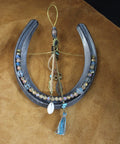 Rustic horseshoe charm hand-beaded with vintage accents, feathers, and coastal details.