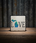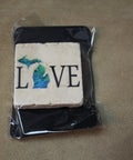 Crafted from natural stone, this square magnet features the word LOVE, with the letter "O" replaced by a vivid blue-green silhouette of Michigan's upper and lower peninsulas. The textured surface of the stone gives it a rugged, authentic look, and the design is printed in a bold, crisp style. It’s packaged neatly in a clear protective wrap with a black backing.