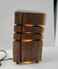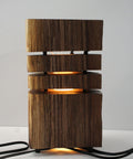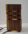 A bold handcrafted lamp with stacked dark wood and warm amber glow.
