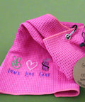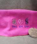 golf towel, pink golf towel, microfiber golf towel, embroidered golf towel, peace love golf, Suki Bs Creations, waffle weave towel, quick dry towel, small batch handcrafted, golf gift