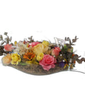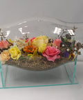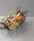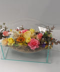 Add timeless beauty to your home with this elegant glass floral display. Housed in a uniquely shaped clear glass vase with a sturdy glass stand, this arrangement showcases a vibrant mix of lifelike flowers in full bloom. Featuring soft yellow, pink, peach, and orange roses paired with delicate greenery and pearl accents, it creates a stunning focal point for any space.