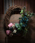 The Woodland Songbird Wreath by Red Brick Wreaths brings the feeling of a quiet walk through the woods into your home. Crafted on an oval grapevine base, this design features deep teal blooms, pine-like greenery, rich leaves, and textured thistle stems. The mix of pink, black, and nature-printed ribbon ties it all together with a soft vintage flair. This wreath is perfect for year-round display or as a thoughtful seasonal transition piece for late summer through fall.