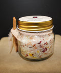 A charming glass jar filled with natural bath soak crystals in a swirl of white, pink, and rose petals. The jar is sealed with a golden lid and dressed with a soft neutral-toned fabric ribbon and a miniature wooden scoop—giving it a rustic and elegant handmade look.