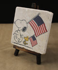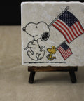 This charming stone tile features Snoopy and Woodstock proudly parading with American flags. The image is etched onto a natural creamy stone tile, giving it a rustic texture and timeless appeal. Snoopy leads the way with a large flag while Woodstock follows with a mini one, all with bright red, white, and blue vibrancy. The piece is displayed on a small wooden easel, ready to decorate any mantle, shelf, or tabletop.