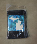 This square magnet features a natural stone base with a stunning galaxy-inspired background in rich shades of teal, blue, and starry white. Centered on the magnet is a crisp silhouette of Michigan’s Upper and Lower Peninsulas, standing out beautifully against the swirling starlit backdrop. The piece is neatly packaged with a black backing and sealed in clear wrap.