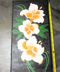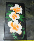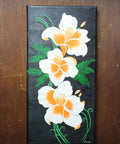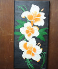 Hand-painted canvas with vibrant orange and white lilies on deep black backdrop.