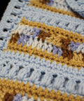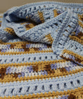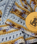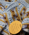Hand-crocheted in earthy blue and brown tones, this cozy baby blanket is built for cuddles.