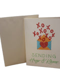 sending hugs card sukis creations, handmade xoxo greeting card, love card with heart and envelope, hand drawn stitched style card, just because card made in Michigan, thinking of you handmade card, small business greeting cards, sukis creations cards armade in MI