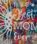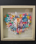 Celebrate Mom with this heartfelt handcrafted keepsake—a stunning shadow box featuring a vivid heart made entirely from intricately rolled and sculpted paper flowers in a rainbow of hues. The heart shape bursts with soft pastels and bold brights, including rich pinks, sunny yellows, deep blues, and dreamy purples. Overlaid on the glass is a delicate white vinyl cutout of a sunflower paired with the loving message To The Best Mom Ever in a mix of playful script and classic lettering. The frame is a light, natural wood tone that brings a fresh, clean farmhouse touch, perfect for gifting or displaying with pride in any home.