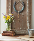 Crafted by hand from an authentic steel horseshoe, this Live Lucky piece brings a peaceful western charm to your home or barn. Lined with turquoise chips and embossed silver beads, the top is strung with natural suede leather, while the bottom is adorned with long fringe and feather-shaped details. It’s a perfect blend of strength, softness, and spirit—ideal for anyone who loves the open range and handcrafted artistry.