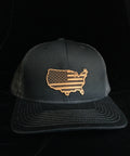 Classic black snapback hat featuring a real leather USA map patch with flag design.