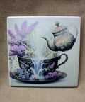 This square ceramic coaster from June Bugs features a dreamy and artistic woodland tea scene that transports you into a fairytale. A delicately ornate teapot appears to pour a cascading waterfall into an equally elegant teacup, with lush lilac blooms, hydrangeas, and a gentle deer peeking out from the rim. Soft pastels in purple, lavender, and sage green set against the clean white ceramic base make this piece both charming and eye-catching.