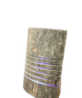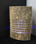 Crafted with intention and Michigan pride, this tall rustic log lamp by Brian Chrismon is a show-stopper. Made from a solid chunk of hardwood, it’s carved with flowing grooves that glow a subtle, moody purple when illuminated. The natural textures of the split log are preserved, offering a bold, organic presence that pairs beautifully with the unexpected pop of modern color. Perfect for a creative nook or calming evening space.