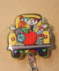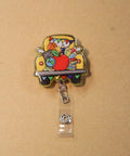 A cheerful badge reel for teachers, featuring a whimsical yellow truck filled with vibrant school-themed items.